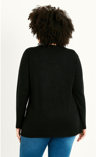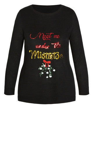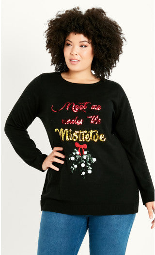 Get festive-ready in the mistletoe sequin sweater. Finished with a relaxed, hip length hemline and indulge your curves in comfort while the front sequin graphic detailing takes center stage.
