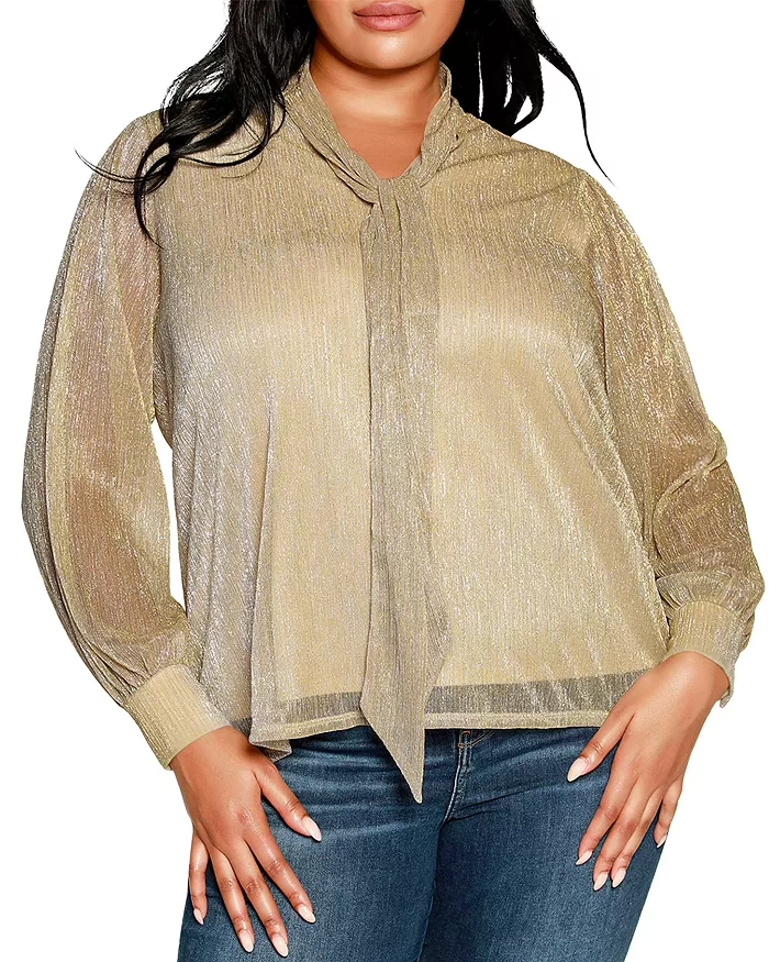 Belldini Women's Plus Size Crinkled Tie Neck Top. Featuring a gorgeous pleated fabric with the perfect amount of glimmer and shine, this top is perfect for a party or evening out!