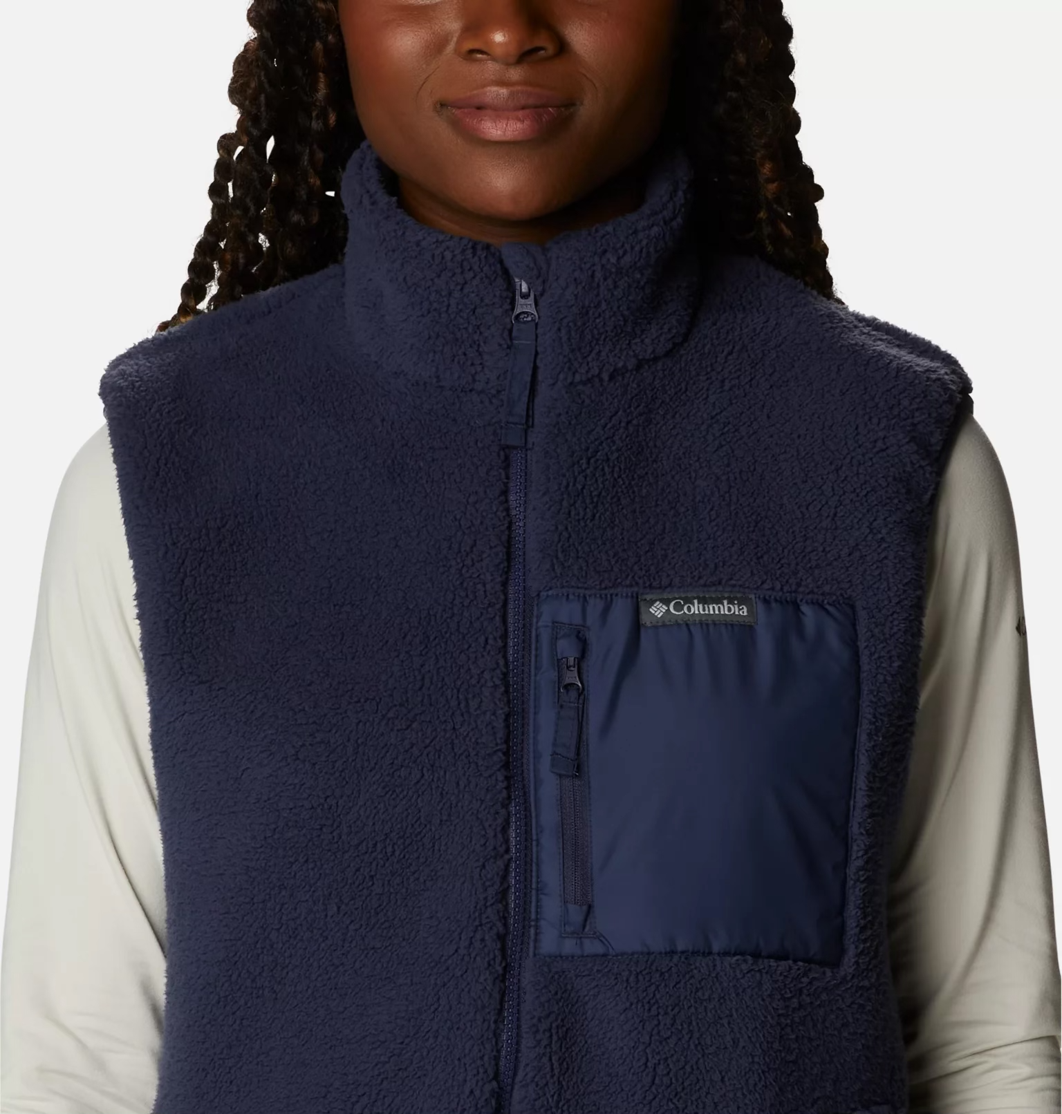 A Sherpa fleece vest with pockets adds warmth and style to any outfit. Cozy up in this high-necked fleece vest to add warmth and style to any outfit.