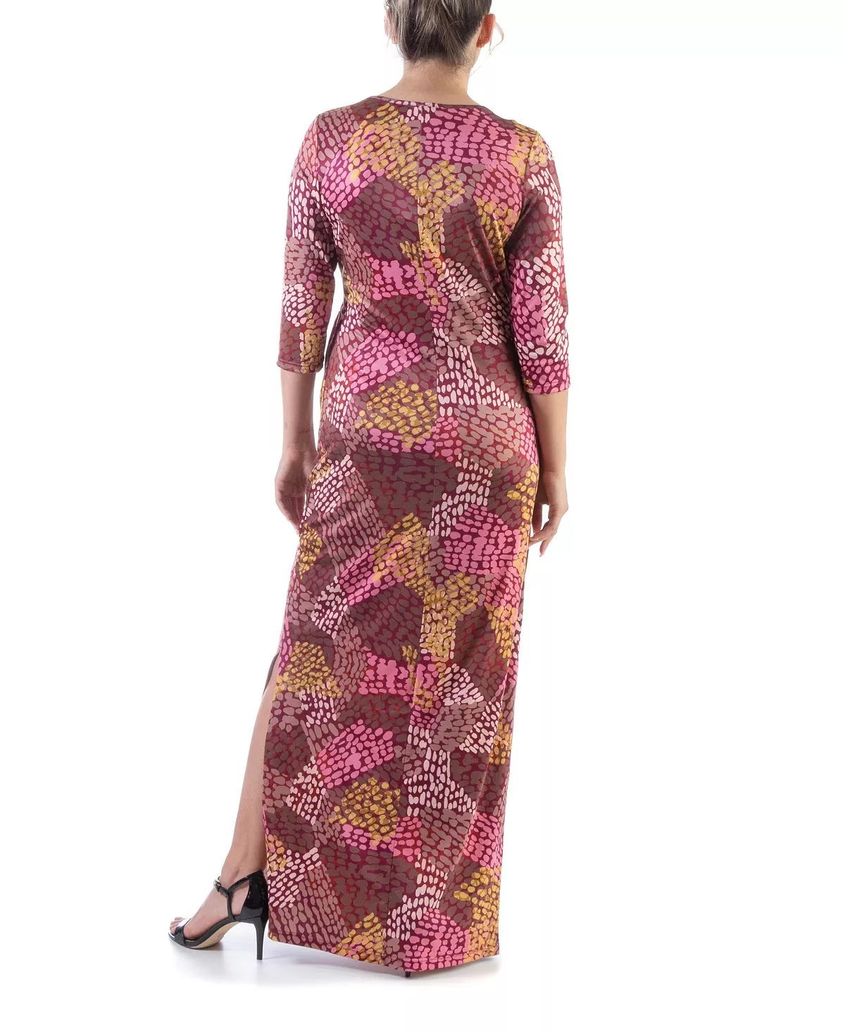 An elegant yet comfortable plus size maxi dress style that is perfect for any special occasion. Featuring a neckline with a faux wrap detail on the front that allows you to adjust the cleavage. The three quarter length sleeves add a modern touch along with the tasteful side slit.