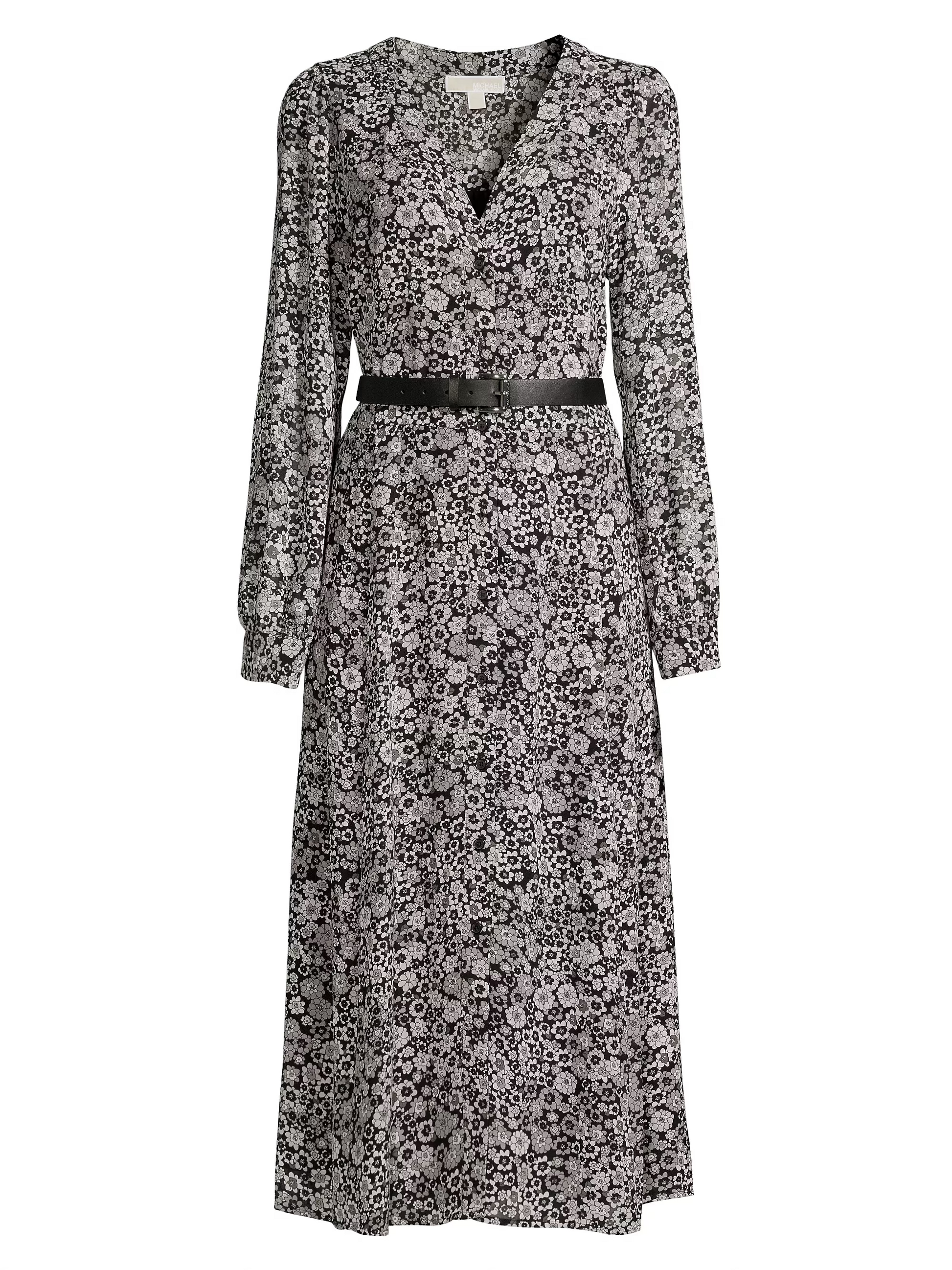 Michael Michael Kors brings unmatched style to your wardrobe with this floral-print button-down dress, featuring a removable belt for a more-defined silhouette. Belted midi shirtdress with a plunging V-neck and micro zinnia floral print.
